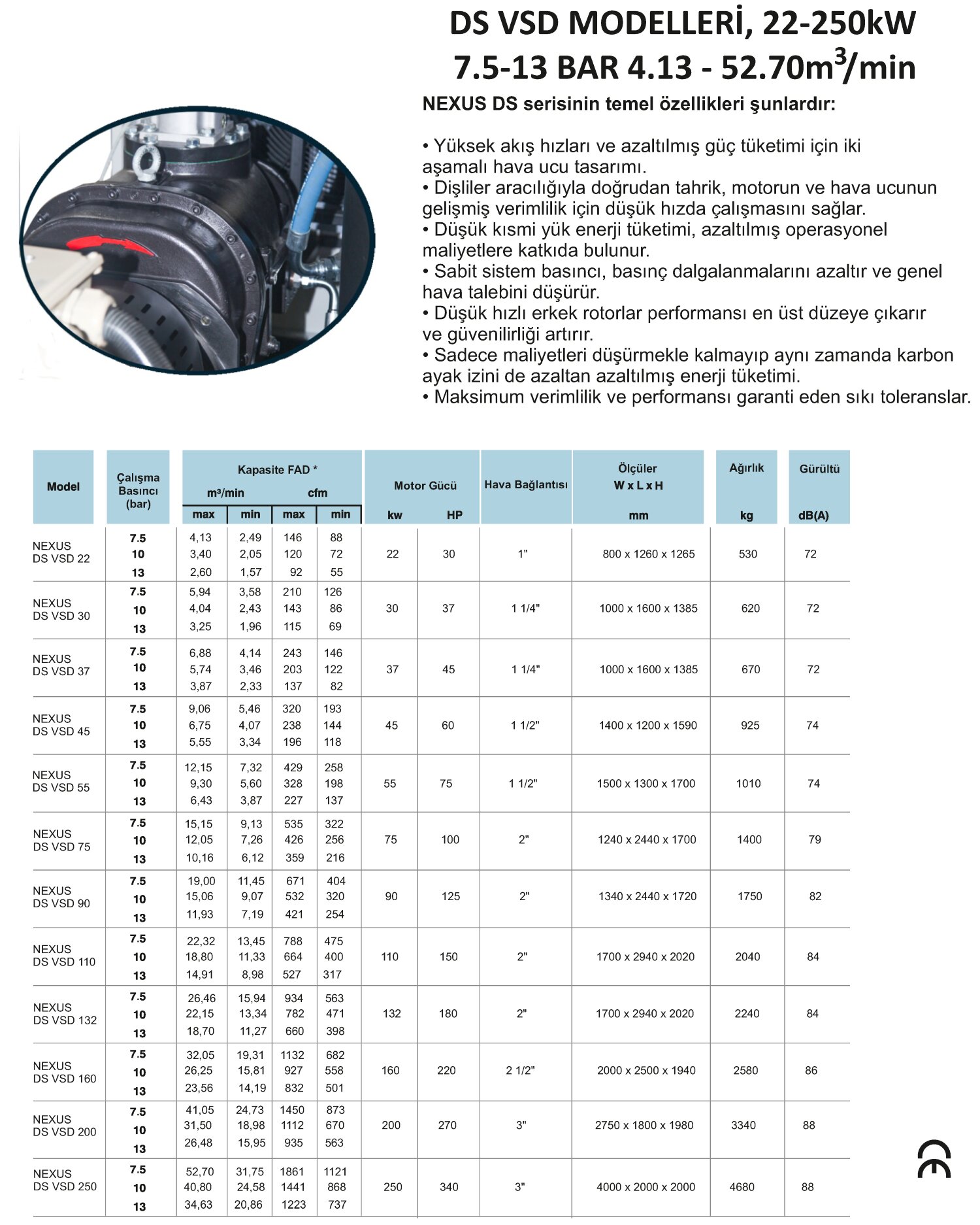 DS VSD MODELLERİ, 22-250kW 7.5-13 BAR 4.13 - 52.70m /min3